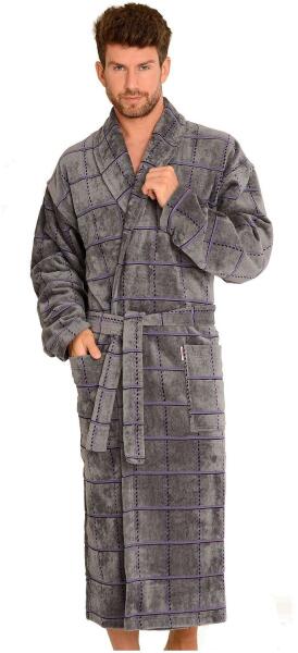 Kiváló minőségű pamutból készült férfi frottír fürdőköpeny kendőgallérral. Varrott zsebek az oldalán és a mellkason. derékban megkötözve. Anyaga: 100% pamut