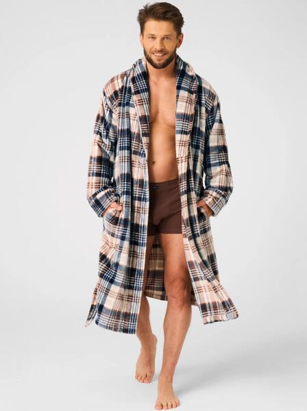 Férfi fürdőköpeny- puha, kockás kötött anyag- sálgallér- derékban megkötve- kényelmes zsebek a csípőnÖsszetétel: 100% poliészter