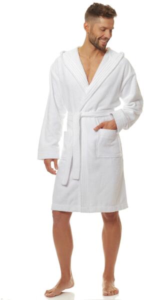 Rövid férfi fürdőköpeny kapucnival, derekán megkötve, puha frottír kötött anyagból. Külső oldalzsebek. Kellemes tapintású, kényelmes viseletet garantál. Anyaga: 100% pamut