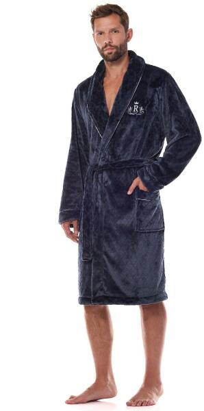 Férfi fürdőköpeny - kendőgallér - kellemes és puha anyag, magasított mintával - derékban megkötő - mandzsetta és gallér kontrasztos színű díszítéssel bélelt - kényelmes zsebek az oldalán Összetétel: 100% poliészter