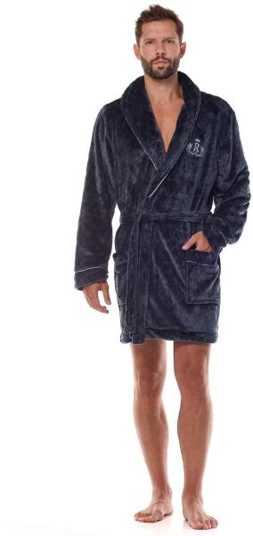 Rövid férfi fürdőköpeny - kellemes és puha anyag - kendőgallér - hímzett applikáció a mellkason - derékban megkötés - mandzsetta és gallér egységes szegéllyel bélelt - praktikus zsebek az oldalakon Összetétel: 100% poliészter