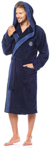 Hosszú férfi fürdőköpeny kapucnival Derékban megkötözve Puha kötöttáruból készült (puha) Külső oldalzsebek Folt a mellkason Kellemes tapintású, kényelmes viseletet garantál Anyaga: 100% poliészter
