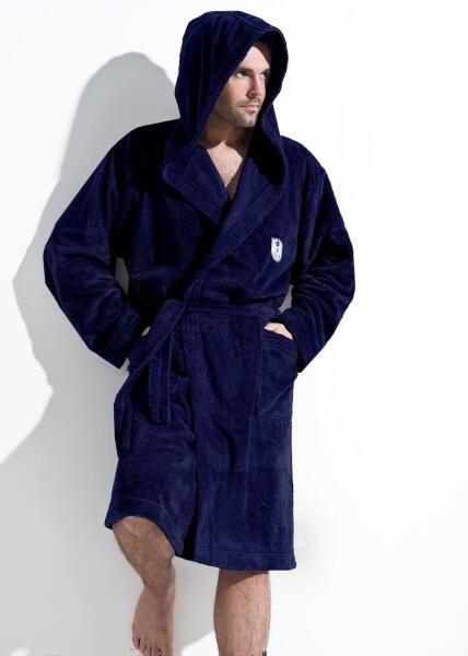 Rövid, kényelmes Iwo férfi fürdőköpeny kellemes puha anyagból készült kapucnival. Derékban övvel van megkötve, mindkét oldalán praktikus zsebek találhatók. A férfi fürdőköpeny meleg meleg érzést kölcsönöz a testnek fürdés után. Vigye magával nyaralásra vagy wellness tartózkodásra. Anyaga: 100% poliészter